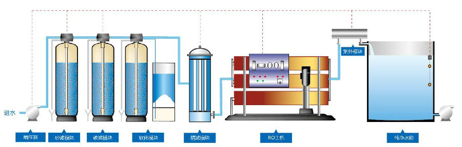 原水箱→增压泵→多介质过滤器→活性炭过滤器→保安过滤器→高压泵→一级反渗透→纯水箱