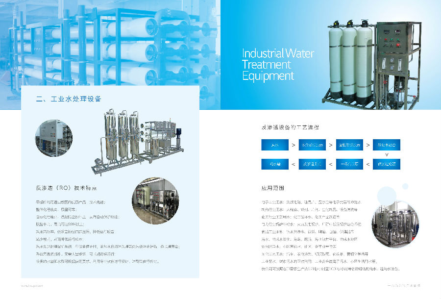 反渗透设备能有效地去除水中的带电离子、无机物、胶体微粒、细菌及有机物质等,是纯水制取、超纯水制备、纯化水制取以及苦咸水脱盐和废水处理工艺中的设备,广泛用于电子、电力、医药、食品、轻纺、化工、发电、科研等用水领域。