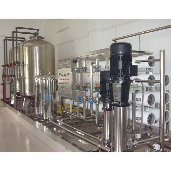原水首先进入多介质过滤器,去除水中固体颗粒及悬浮杂质降低浊度,再进入活性碳过滤器吸附水中的余氯、有机物和重金属离子,优质活性炭可大大延长反渗透主机中膜的使用寿命。从而有效地保护反渗透膜的工作状态。接着通过两级精密过滤器,分别以5μm和1μm的精度进一步降低水的浊度,满足反渗透膜的进水要求。最后由反渗透膜在高压下去除水中的盐类物质,去除盐份的水即为纯水,被去除的盐份形成浓水被排放掉。